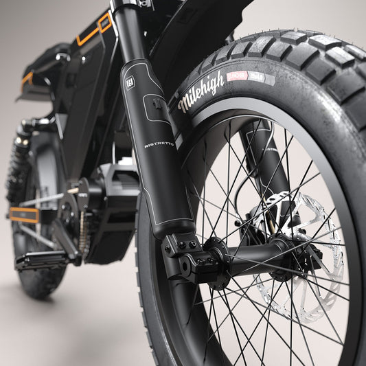 The Ristretto® 512 includes a DNM USD-8FAT inverted front fork suspension system. These premium forks use AL 7075 tubes, sturdy rubber seals, a 15mm Thru-axle design, and large plastic fork guards.